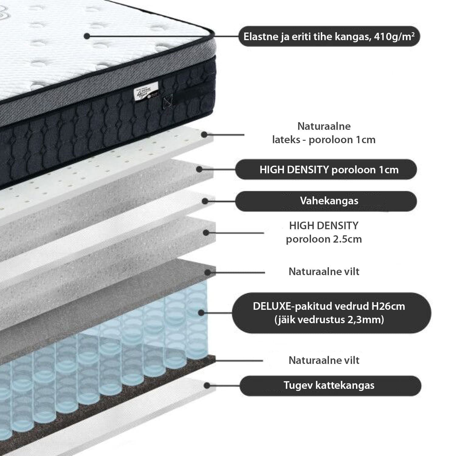 Madratsil on pakitud deluxe-pocket vedrustus (2,3mm/jäik).