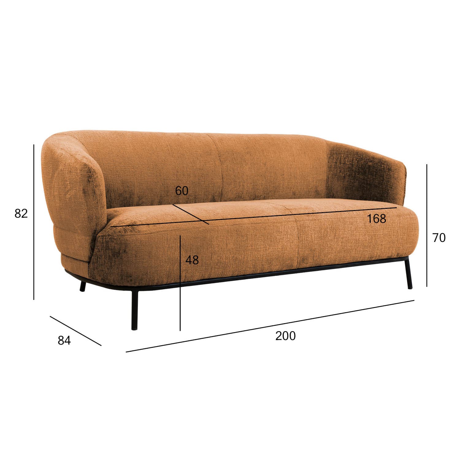 Diivan GEMALA 2,5 kohaline, oran˛. Diivani pehme polsterdusega iste on kaetud sametise polüesterkangaga, Martindale väärtus 41 000. Diivani karkass on valmistatud puidust ja vineerist. Istme sees on pocket vedruplokk. Polsterduseks on kasutatud polüuretaanvahtu ja polüesterkiudu. Diivani üldmõõdud on 200x84xH82cm. Istme laius 168cm, istme sügavus 60cm, istme kõrgus 48cm. Käetoe kõrgus maast 70cm. Diivanil on mustad metallist jalad H17cm.