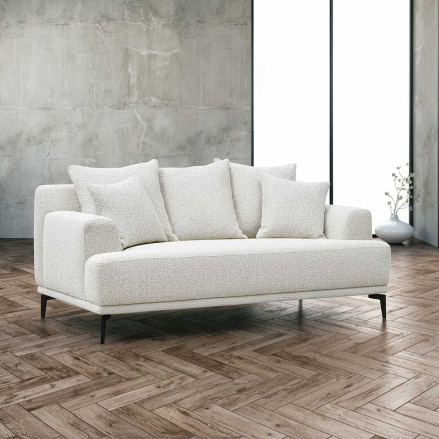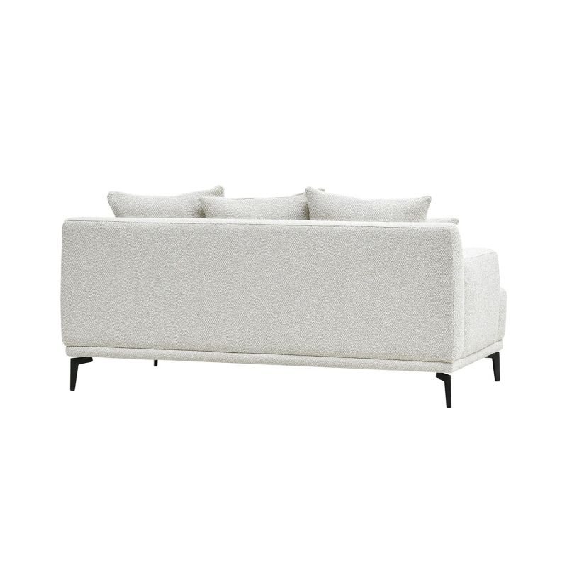 Luksuslik, efektse kangaga kaetud hele diivan on tõeline pilgupüüdja. Lahtised seljatoepadjad mõjuvad kutsuvalt ja pakuvad suurepärast mugavust.