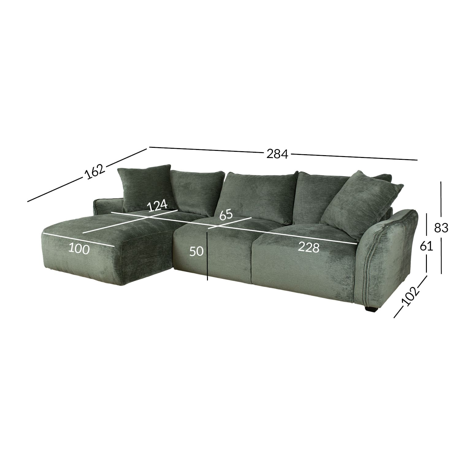 Diivani üldmõõdud on 284×162/102xH83cm. Istme laius 154+74cm, istme sügavus 65/124cm. Istme kõrgus 50cm. Käetoe kõrgus maast 61cm.