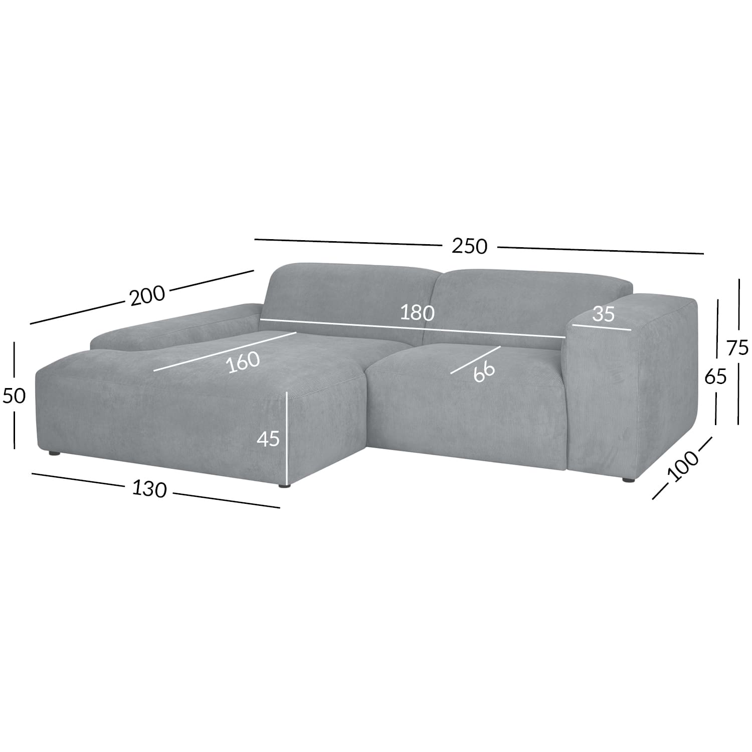 Diivan on kaetud polüesterkangaga. Katted pole eemaldatavad. Raam on valmistatud täispuidust, vineerist, puitkiud- ja puitlaastplaadist, kaetud porolooniga. Käetoe pealne on kaetud 30mm porolooniga. Tootel on siksak vedrustus, mis on kaetud kangaga. Jalad on plastikust, kõrgusega 3,5cm. Istumiskõrgus on 45cm, istumissügavus 66cm. Toote mõõdud on 250×200/100xH75cm. Valmistatud Euroopas.