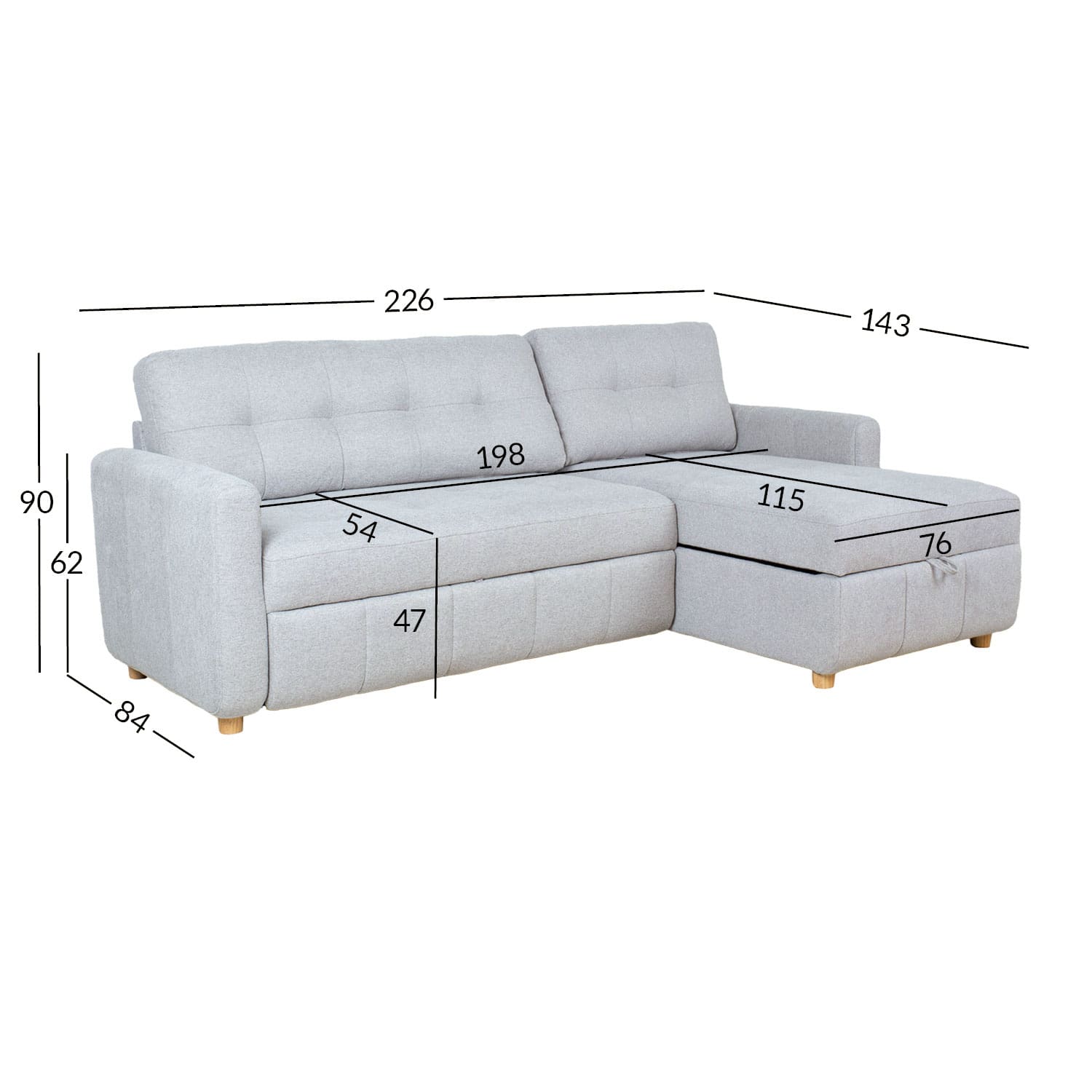 Diivani üldmõõdud: 226 x 84/143 x H90 cm.