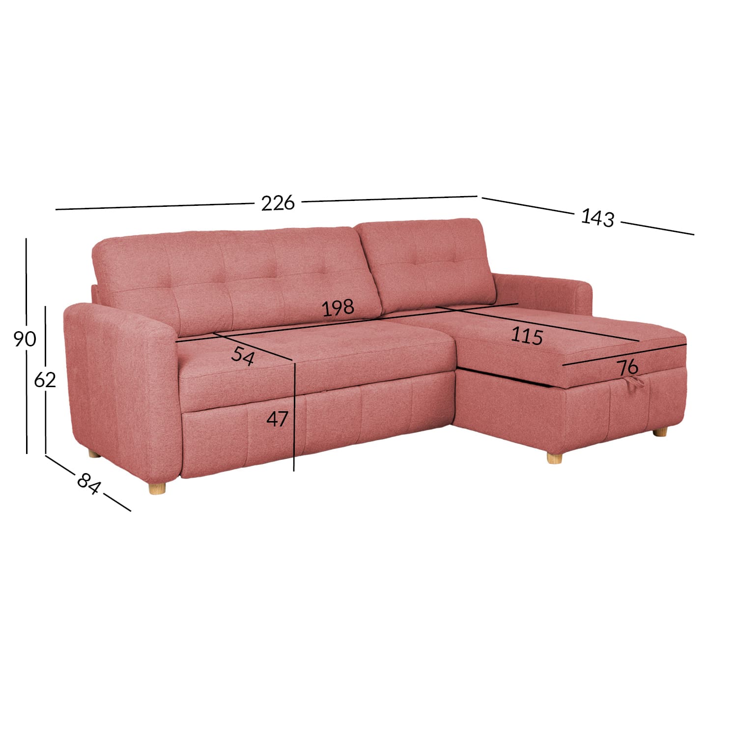 Diivani üldmõõdud on 226×84/143xH90cm. Istme laius 124+74cm, istme sügavus 54/115cm, istme kõrgus 47cm. Käetoe kõrgus maast 62cm.