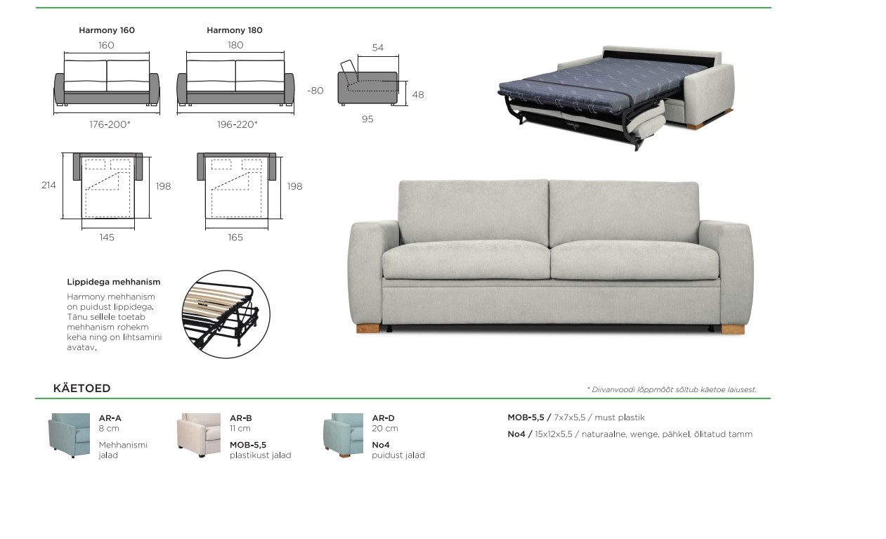 Sobib ideaalselt väiksemasse korterisse, kus magamistuba ja elutuba on üks – naudi lihtsust ja mugavust. Päeval mugav diivan raamatu lugemiseks, teleka vaatamiseks – õhtul mõnus magamisase. Diivan on Eestis toodetud.