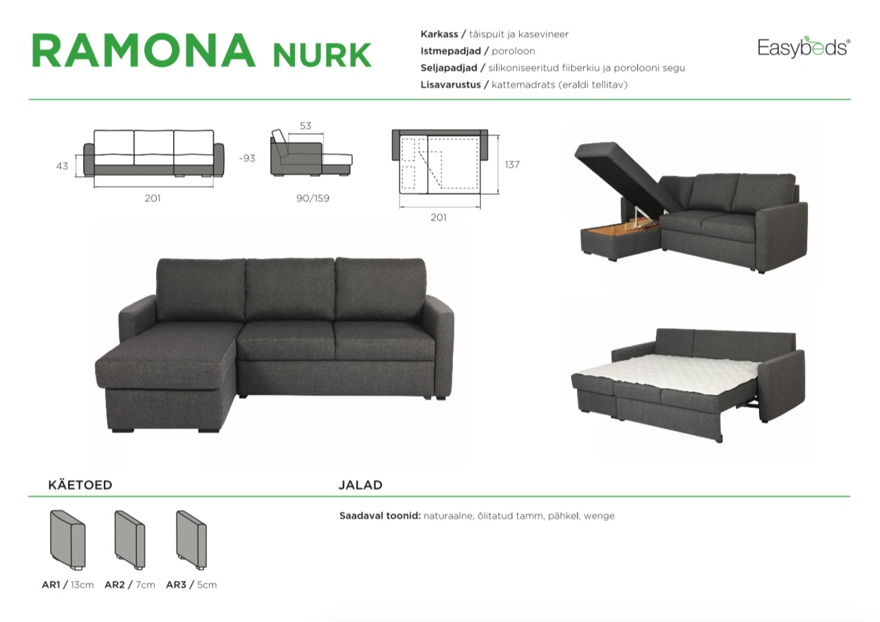 Ramona nurgadiivanvoodi on stiilse välimusega, lihtsa süsteemiga ning kergesti lahtikäiv. Nurga all peidab ennast mahukas pesukast tekkide-patjade ja kõige muu jaoks. Mugav istumisosa ning magamiseks mõnus ruum.