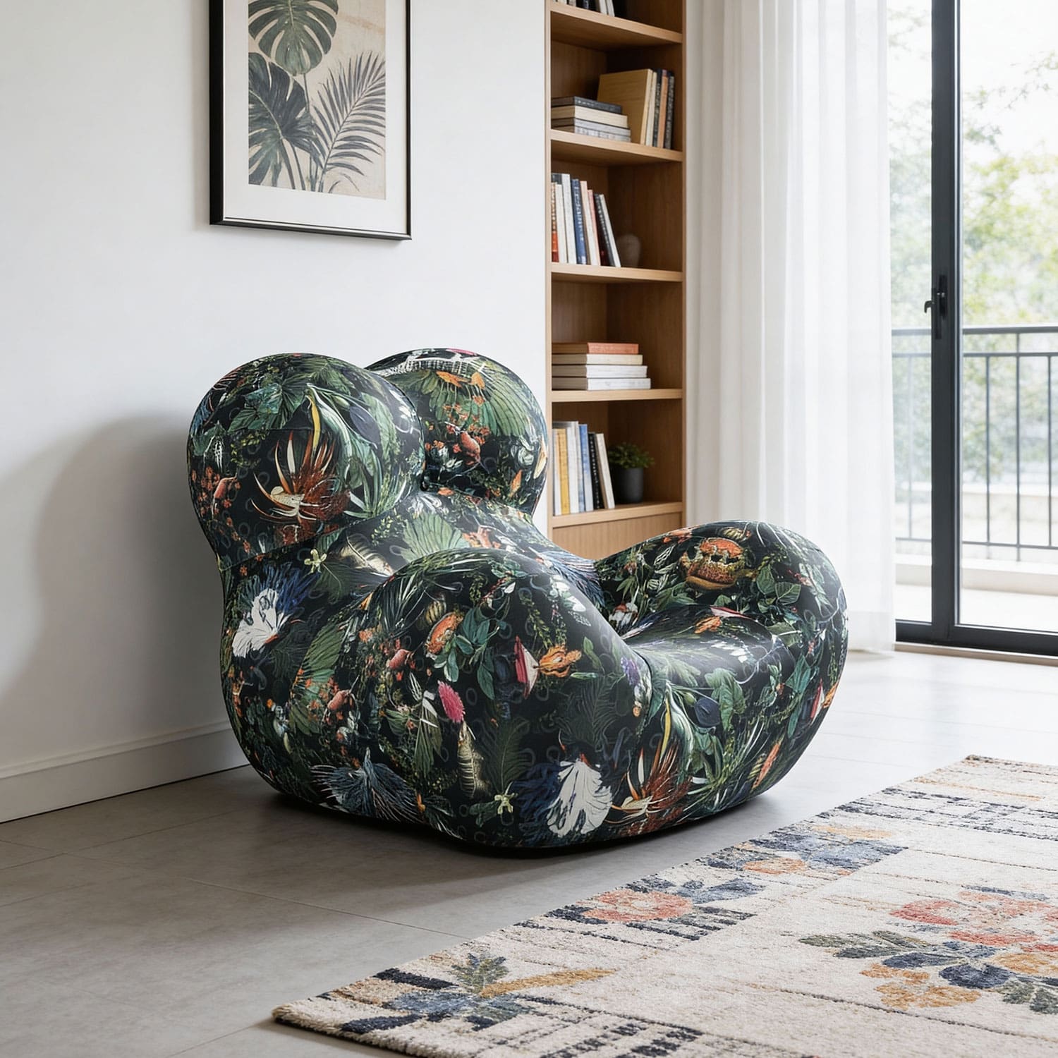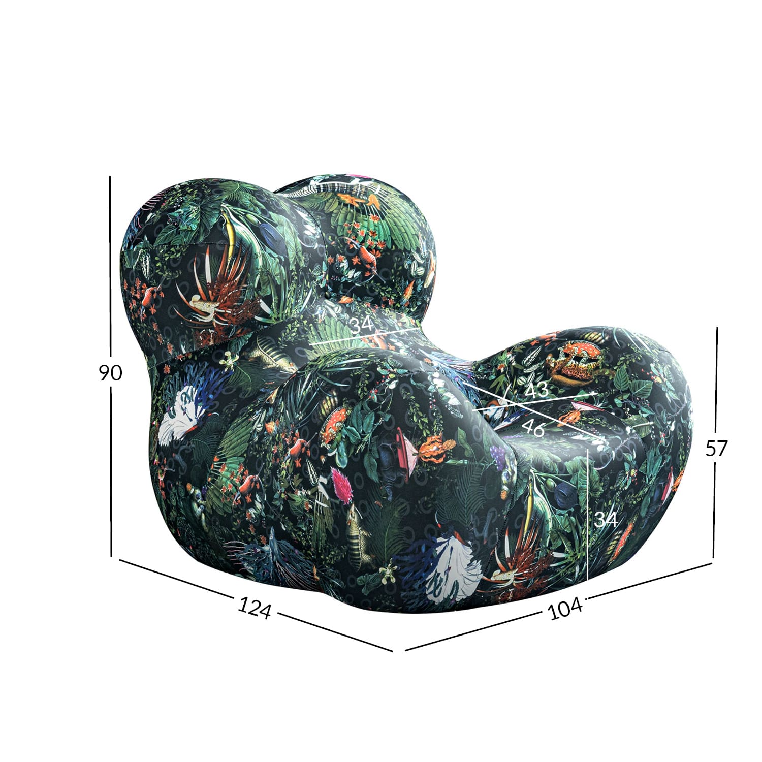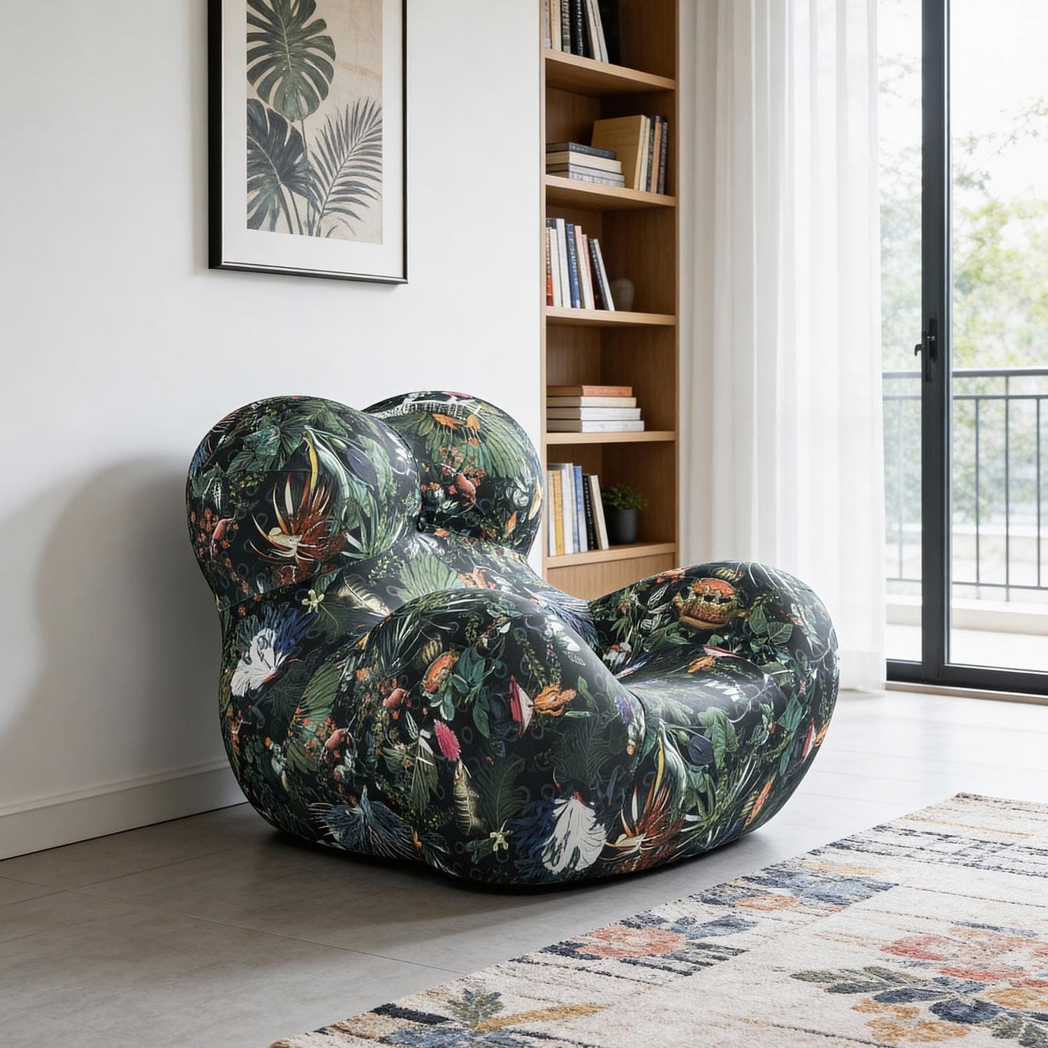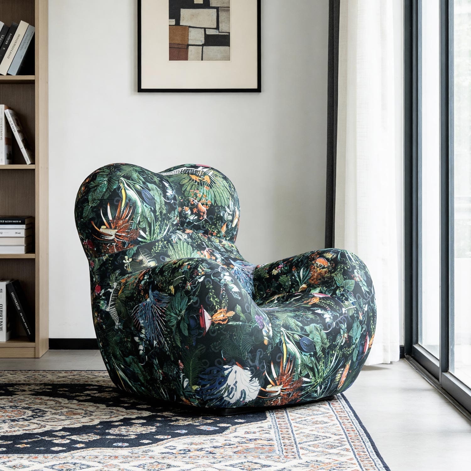 See efektne tugitool ühendab skulpturaalse vormi ja rikkaliku, loodusest inspireeritud mustri. Sügavad rohelised toonid, detailirohked taime- ja loomamotiivid loovad justkui eksootilise džunglimaailma, mis muudab iga ruumi elavaks ja meeldejäävaks.