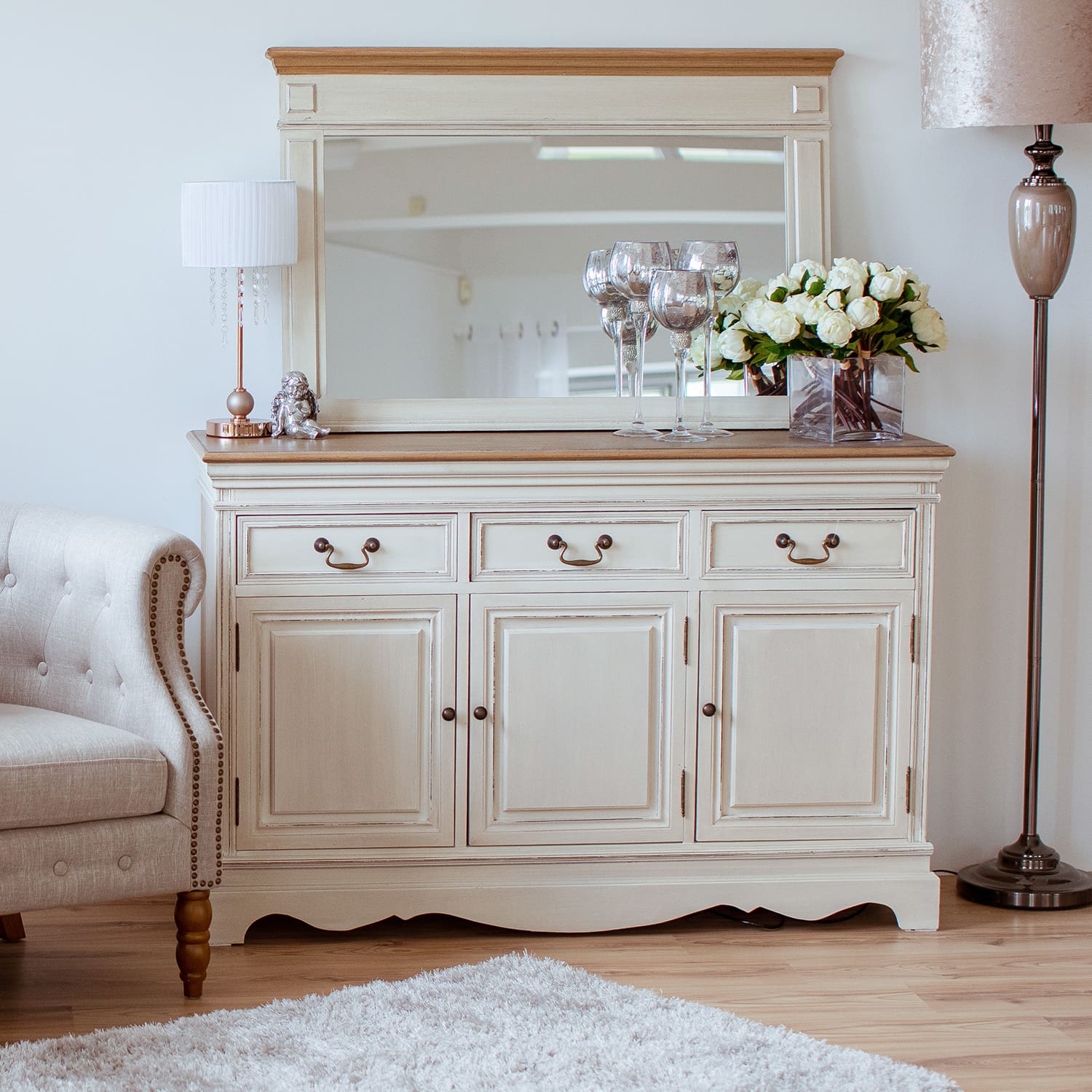 Peegel SAMIRA 107×4,5x70cm, antiikvalge/naturaalne. Peegli raam on valmistatud saarepuidust ja viimistletud antiikvalge värviga. Ülemine profiilliist on valmistatud naturaalses toonis paulownia puidust.