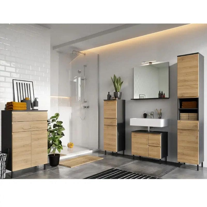 Kogu sarja mööbel on valmistatud melamiinkattega mööbliplaadist ning termovormitud MDFist. Seega on see ajas kestev ning niiskus- ja kriimustuskindel. Peeglil olev LED-tuli peegelpinna kohal näitab mugavat valgustust.