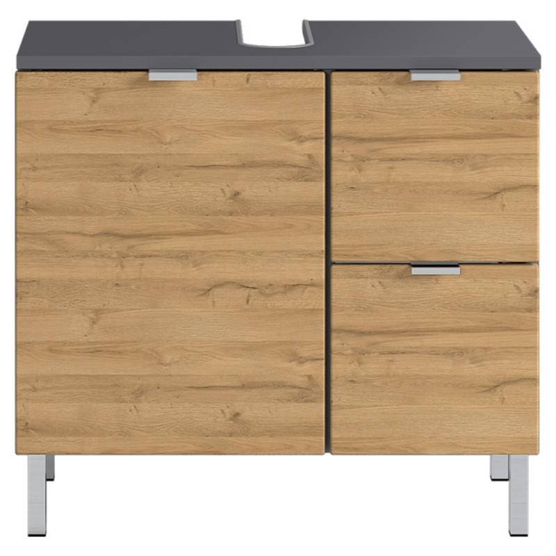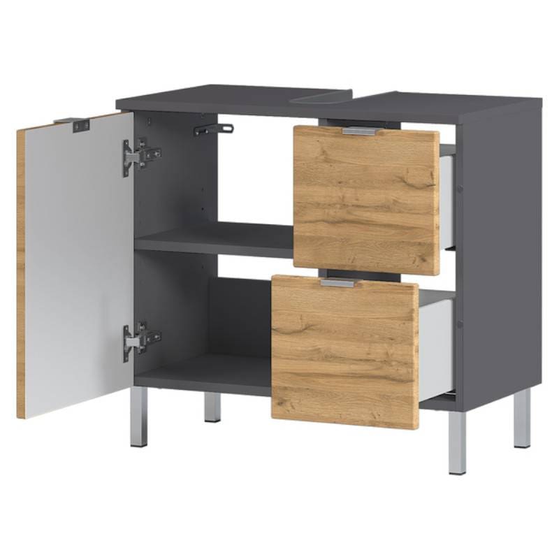 Valamukapp on kaasaegses stiilis, uksed grandson tamme imitatsioonis, karkass grafiit. Kapi jalad ning käepidemed on metallist ning viimistletud kroomiga. Valamukapi uks ning sahtlid on vaikselt sulguvad. Kapp on valmistatud mööbliplaadist ning kvaliteetsed ABS-ääred muudavad vannitoakapid eriti põrutus- ja löögikindlaks. Ukse taga olev vaheriiul on reguleeritava kõrgusega. Vannitoamööbel Mauresa on kaetud melamiinvaigu kattega, mis on niiskusekindel.